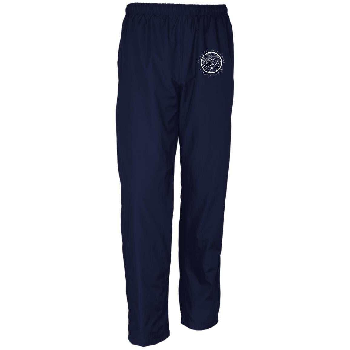 Covered waistband with inside elastic drawcord, Side seam pockets, & Elastic hem leg bottoms