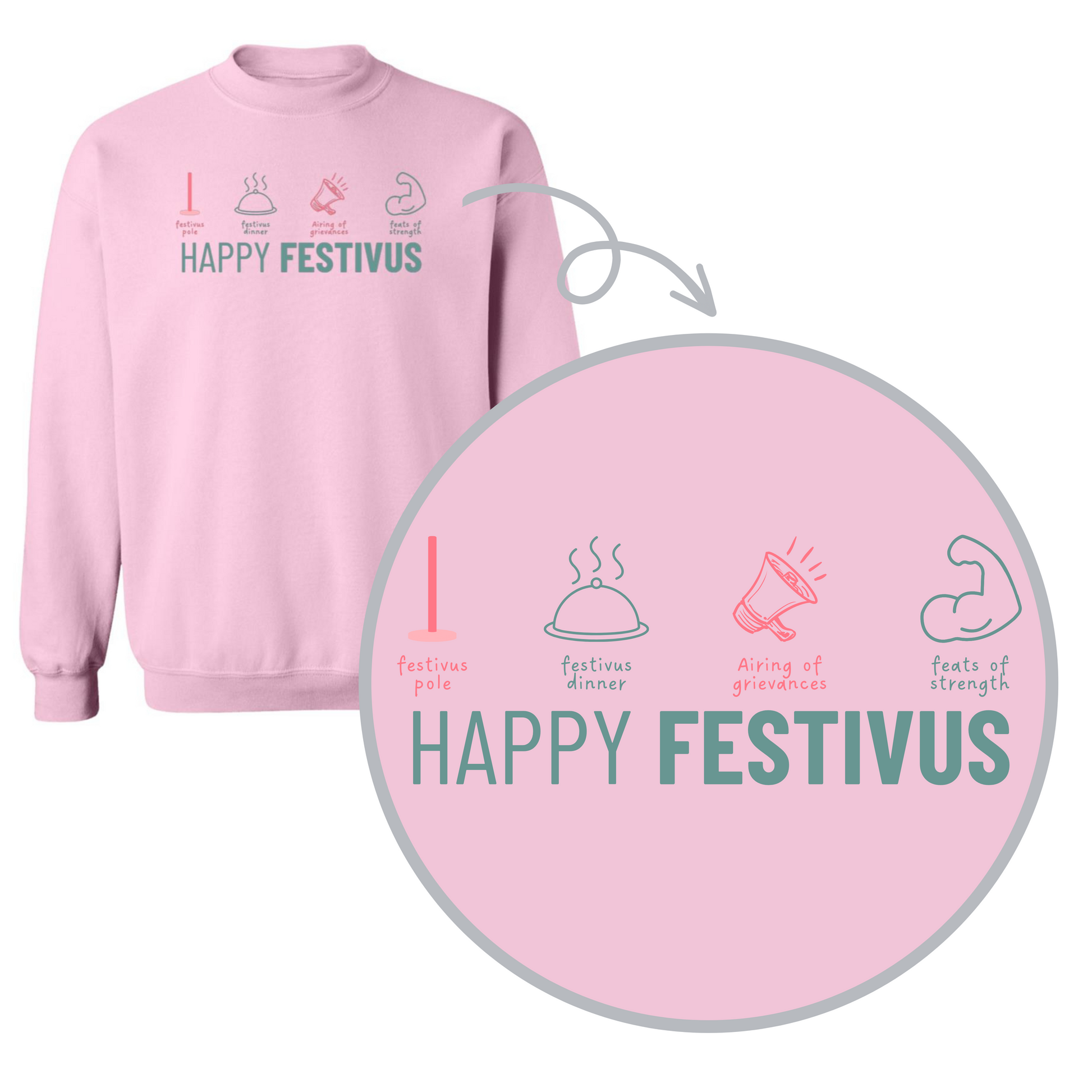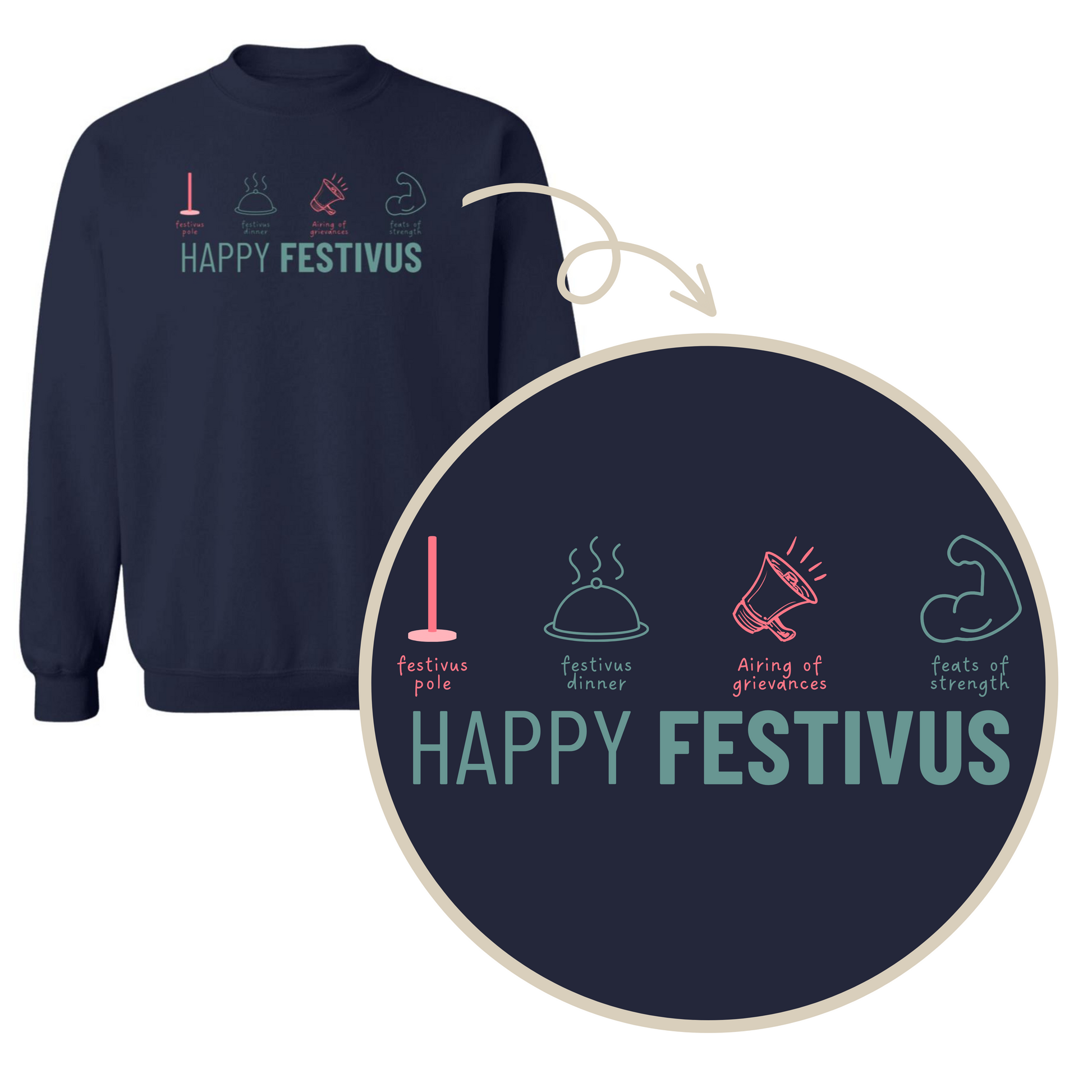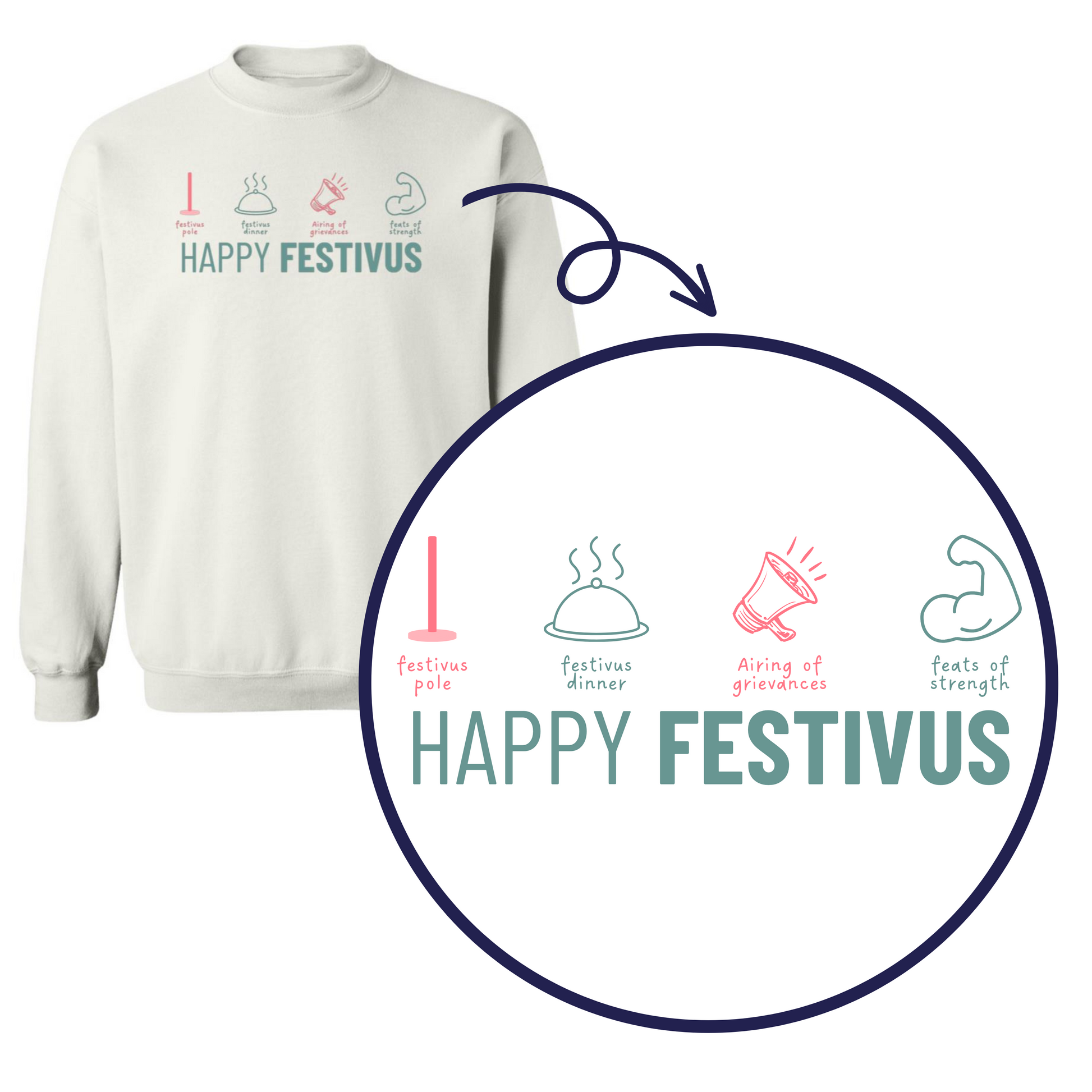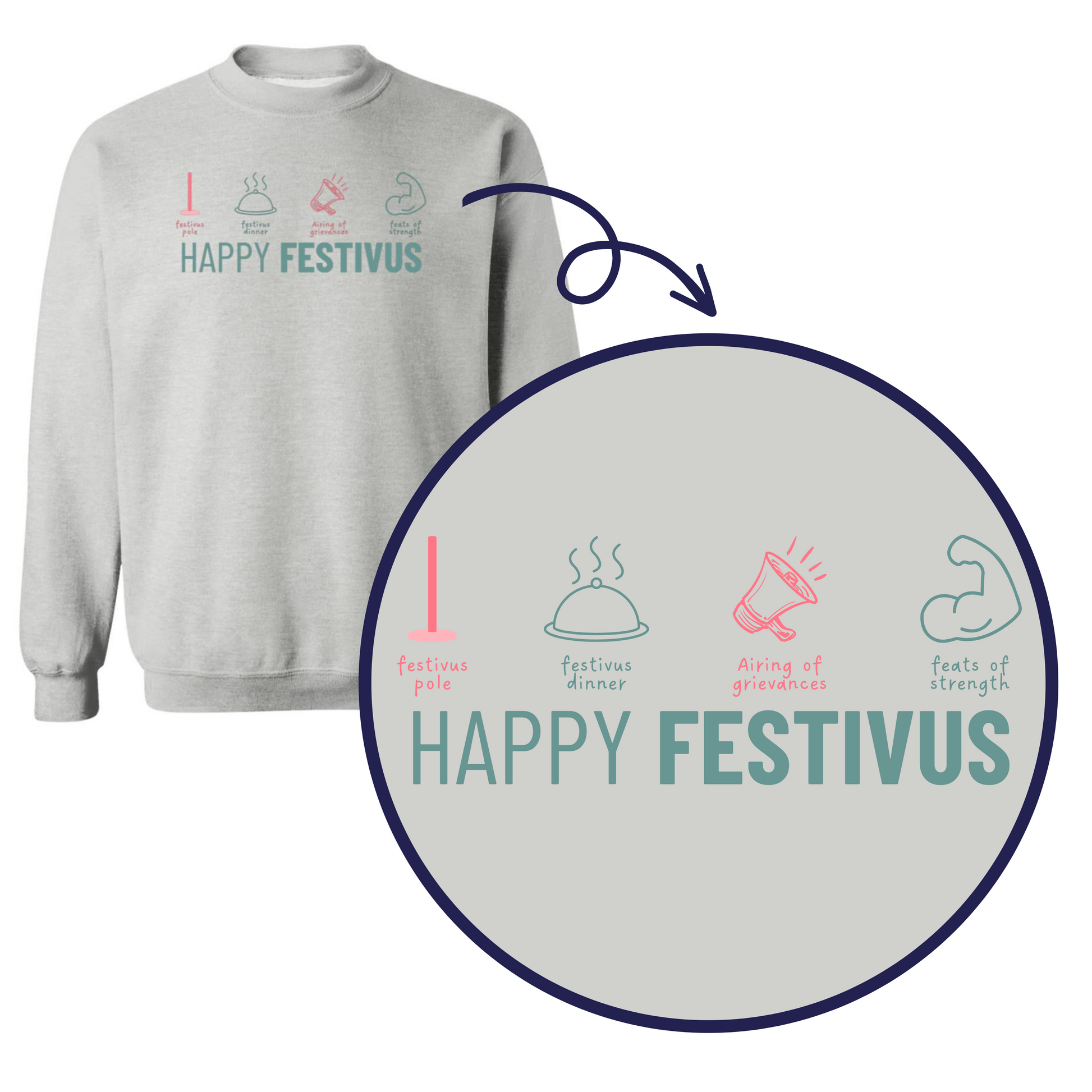 This crewneck sweatshirt features a whimsical and detailed design that captures the essence of Festivus, the alternative holiday that's taken the Seinfeld fandom by storm. The Festivus Elements include:
