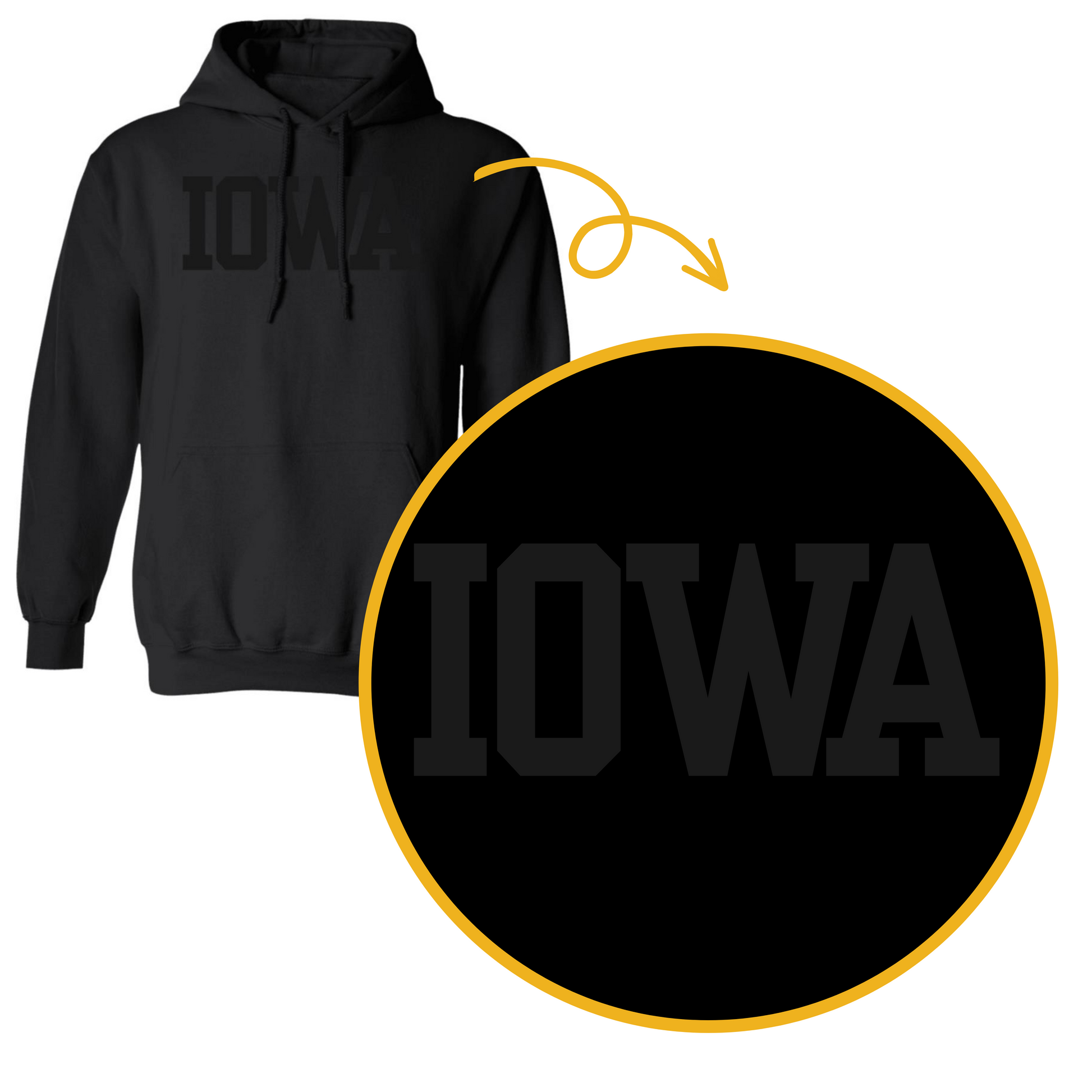 Introducing our Iowa Black on Black Collegiate Hoodie, the epitome of sleek style and team spirit for University of Iowa fans and avid Iowa football enthusiasts. This hoodie seamlessly combines comfort, fashion, and undeniable Hawkeye pride.
